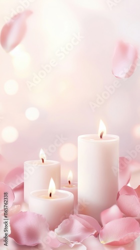 Serene candlelight with pink rose petals and soft bokeh background