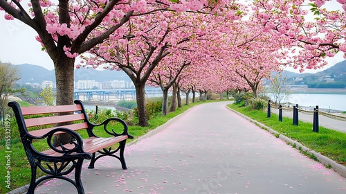 Serene Cherry Blossom Path Park Bench Spring Scenery