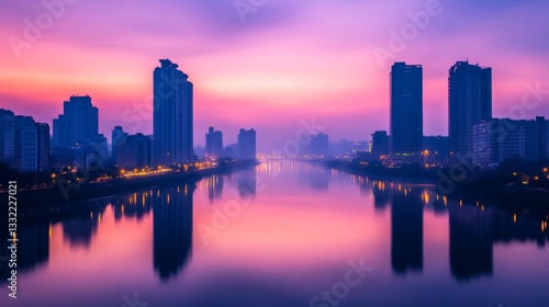 Serene city skyline at dusk with vibrant colors reflecting on calm water, showcasing urban life