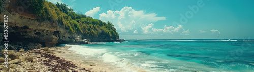 Serene Coastal Landscape with Clear Blue Waters, Lush Green Cliffs, and Sandy Shoreline under a Bright Sky with Fluffy White Clouds A Tranquil Beach Scene Ideal for Relaxation and Nature Lovers