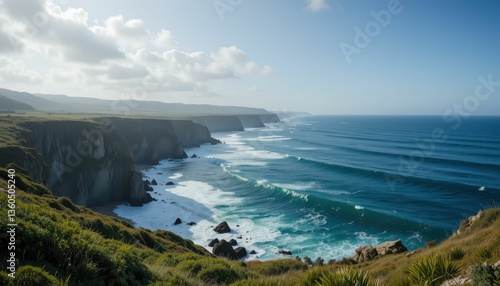 coast, wave, cliff, ocean, landscape, horizon, blue, nature, sunlight, water, shore, sky, scenery, calmness, travel, rural, rocky, adventure, tour tourism, beauty, summer, environment, peaceful, hill, sea, foam, cloud, ripple, bright, grass, green, geography, natural, rock, vista, journey, explore, remote, coastline, formation, breathtaking, idylli, serene, view