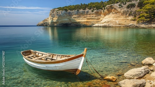 Serene Coastal Scene: Wooden Boat Mooring in Crystal Clear Water