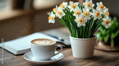 hot drink, cup, latte, daffodil, flower, notebook, book, table, spring, morning, cafes, cosy, relaxing, peaceful, calm, serenity, nubes, floral, plant, pot, white, wooden, brown, warm, natural, light, interior, home, comfort, tea, drink, beverage, desk, work, office, journal, writing, aroma, smell, springtime