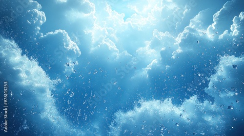 Serene depiction of clouds and water droplets in a blue atmosphere.