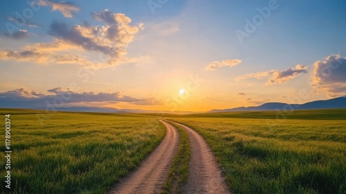 road, dirt, field, green, landscape, sunset, sky, cloud, nature, calmness, rural, evening, travel, horizon, beauty, scenery, sunlight, path, agriculture, spring, summer, vibrant, grass, peaceful, environment, warm, day, background
