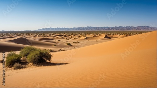 desert, sand, dune, landscape, nature, sky, clear, mountain, horizon, arid, wilderness, vista, scenery, environment, travel, adventure, remote, expanse, sunlight, geology, barren, ridge, hill, formation, dry, plant, bush, shrub, ground, pattern, texture, hot, panorama, elevation, summit, peak, plateau, background, scenic