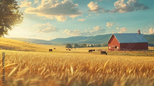 Serene Farm Landscape with Golden Wheat Fields and Cattle Grazing