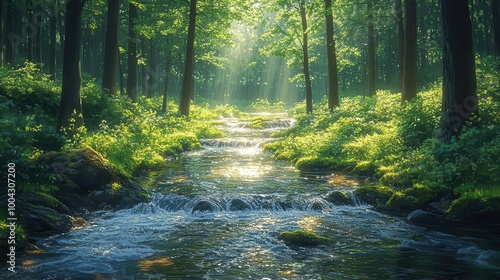 serene forest scene with a gently winding river flowing through dense green foliage capturing the tranquility of nature and the beauty of untouched landscapes
