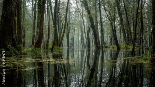 Serene forest scene with misty water reflecting tall trees in a tranquil setting.