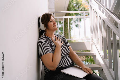 freelancer, businesswoman, earphones, gratitude, eyes closed, laptop, sitting, peaceful, mindfulness, self employed, urban setting, wellness, middle-aged, relaxed