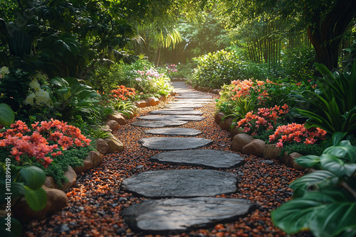 garden, path, paseo, stone, stone, rock, pebble, gravel, greenery, lush, plant, flower, orange, red, pink, white, leaf, tree, sunlight, sunbeam, shadow, tranquil, serene, peaceful, calm, relaxing, nature, landscape, outdoors, scenic, beautiful, vibrant, colourful, tropical, exotic, foliage, blossom, bloom, spring, summer, zen, japanese, asian