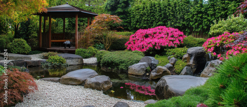 garden, gazebo, flower, greenery, duck pond, rock, landscape, tranquil, nature, peaceful, azalea, water, stone, park, relaxation, scenery, horticulture, botanical, zen, foliage, colourful, environment, landscaping, design, spring, summer, beauty, flora, serenity, natural, peacefulness, space, japanese, ornamental, lush, vibrant, scenic, calmness, area, path, view, plant