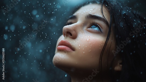 woman, rain, looking, upward, face, serene, beauty, wet, drop, dark, skin, light, eye, head, weather, outside, portrait, female, person, peaceful, calm, pensive, thought, mood, dreamy, thoughtful, melancholic, rainstorm, atmosphere, droplet, humidity, precipitation, glistening, shimmering, aethereal, soft, glow, romantic, wistful, contemplative