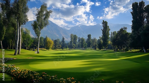 golf, course, mountain, green, tree, nature, scenic, landscape, sky, cloud, summer, day, sport, leisure, beautiful, view, panorama, peaceful, tranquil, serene, calm, relaxing, fresh, vibrant, lush, grass, field, hill, horizon, sun, light, shadow, fairway, putting, game, play, activity, travel, destination