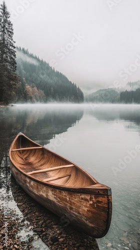 Serene Handcrafted Wooden Canoe by Misty Lake Edge
