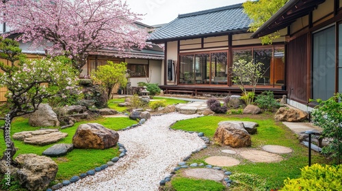Serene Japanese Garden with Cherry Blossoms and Pathway