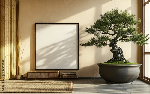 Serene Japanese room, bonsai tree, empty canvas, sunlit