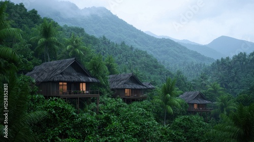 Serene Jungle Retreat with Wooden Cabins Amidst Lush Green Mountains