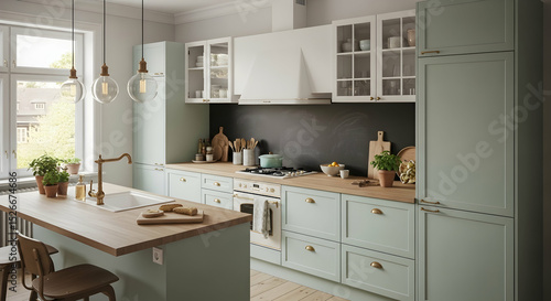 Serene Kitchen Design With Mint Green Cabinets And Wooden Countertops In Bright Interior