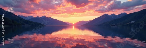 Serene lake at sunset with reflecting mountains and calm water , serene, mountains, peaceful