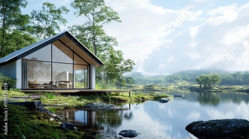 tranquil, lake, house, nature, serene, reflections, water, peaceful, landscape, glasses, tree, modern, architecture, scenery, daylight, outdoors, calm, relaxing, environment, summer, sky, cloud, sunlight, shore, rock, view, wooden, deck, furniture, garden, idylli, beauty, design, rural, vacation, get-away, retreat, escape, minimal, style, calmness, softness