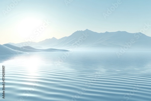 lake, mountain, water, serene, calm, peaceful, tranquil, sky, sun, light, bright, haze, foggy, mist, nature, landscape, scenic, view, coast, shore, beach, hill, horizon, blue, white, water, ripple, smooth, flat, clear, clean, pristine, untouched, still, quiet, remote, isolated, distance, background, environment, outdoors, scenery, day, sunshine, sunlight, natural, beauty