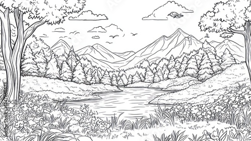 lake, mountain, forest, tree, river, nature, landscape, scenery, view, serene, water, hill, wood, calm, peaceful, summer, spring, colouring, page, book, illustration, art, design, image, background, graphic, drawing, vignetting, picture, photo, printable, activity, relax, calmness, scenic, panorama, beauty, vibrant, majestic, wilderness, green, blue