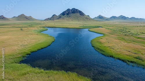 Serene Lake nestled in the Mongolian steppe, surrounded by lush greenery and majestic mountains under a clear blue sky. A picturesque landscape reflecting tranquility and natural beauty.