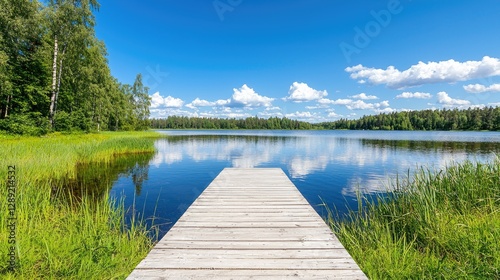 Serene lake pier, summer day, tranquil scene, nature background, perfect for travel brochures