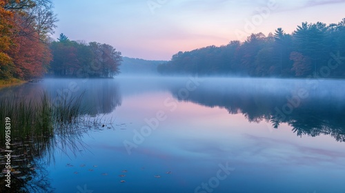 Serene lake scene at dawn with mist and autumn foliage reflecting on the water.