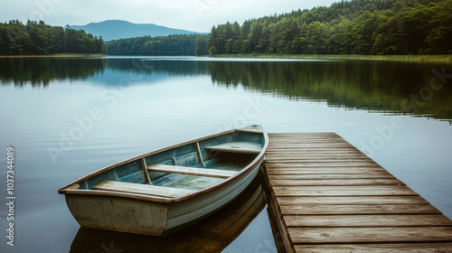 serene lake scene featuring wooden dock and rowboat, surrounded by lush greenery and mountains in background, evokes sense of tranquility and peace