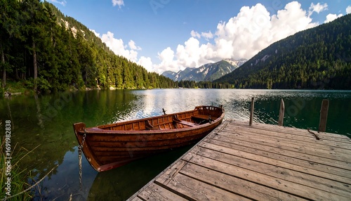 lake, boat, wooden, dock, mountain, forest, tranquil, serene, water, cloud, blue, sky, green, nature, peaceful, scenic, summer, calm, alpine, vista, idylli, landscape, sunshine, mountainous, tree, quiet, beauty, view, fishing, vacation, explore, travel, trip, holiday, wood, brown, sun