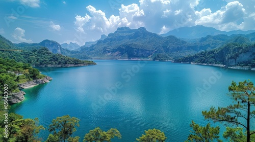 lake, mountain, sky, cloud, water, blue, green, nature, landscape, scenic, view, serene, tranquil, calm, peaceful, beautiful, gorgeous, breathtaking, majestic, verdant, fluffy, clear, bright, sunny, day, summer, spring, horizon, forest, tree, hill, rock, shore, coast, natural, wonder, photo