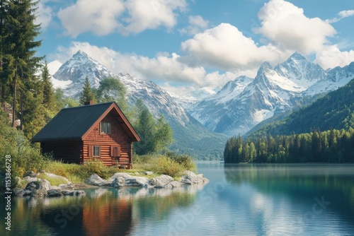 lakeshore, cabin, snow-capped, mountain, peaceful, retreat, nature, calmness, landscape, scenery, winter, water, forest, rustic, get-away, adventure, hiking, camping, serenity, vacation, escape, wildlife, blue skies, cloud, cosy, snow, pine tree, relaxation, scenic view