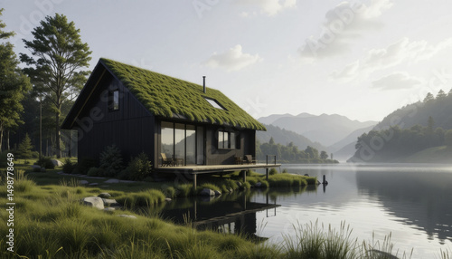 serene lakeside cabin with green roof sits peacefully by water, surrounded by lush trees and distant mountains soft, cloudy sky. tranquil setting evokes sense of calm and connection with nature