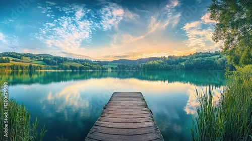lake, sunrise, dawn, peaceful, tranquil, serene, calm, water, sky, cloud, dock, wooden, nature, landscape, scenic, beautiful, idylli, summer, morning, quiet, stillness, relaxing, escape, serenity, contemplation, meditation, mindfulness, horizon, view, picturesque, vibrant, colours, majestic, breathtaking, travel, holiday, vacation