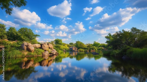 Serene landscape featuring a calm river reflecting fluffy clouds and lush greenery under a blue sky