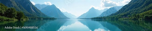 Serene landscape featuring a tranquil lake reflecting the surrounding mountains and lush greenery under a clear sky Ideal for travel, nature, and environmental themes , lake, awe-inspiring, sky