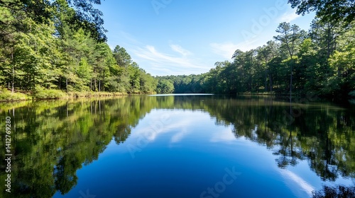 Serene Landscape Featuring Calm Lake Surrounded by Green Forest and Clear Sky : Generative AI
