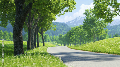 road, tree, landscape, nature, greenery, mountain, serene, peaceful, scenic, pathway, sunlight, blue, sky, summer, vibrant, foliage, travel, adventure, countryside, environment, calmness, rural, view, fresh, air, winding, hill, grass, beautiful, bright, clear, idylli, natural, route, scenery, lush, colours, sunny, open, space, relaxation, escape, journey, exploration, harmony, picturesque, calm, inviting