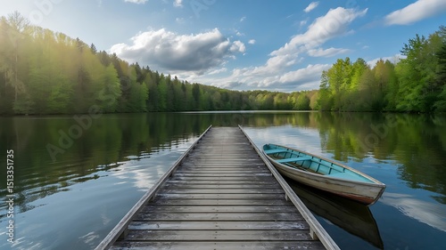 lake, water, dock, boat, wooden, blue, landscape, nature, scenic, outdoors, tree, forest, sky, cloud, sunny, tranquil, peaceful, calm, summer, spring, environment, travel, tour tourism, idylli