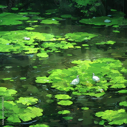 cygnet, duck pond, lily pad, water lily, green, tranquil, serene, nature, bird, wildlife, peaceful, calm, summer, sunlight, leaf, water, digital artwork, painting, illustration, artwork, landscape, environment