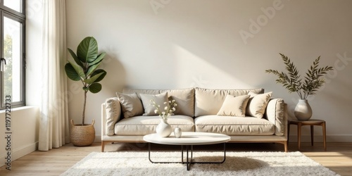 Serene Living Room Interior Design with Neutral Tones and Natural Light Featuring a Comfortable Sofa, Stylish Coffee Table, and Elegant Plant Decor
