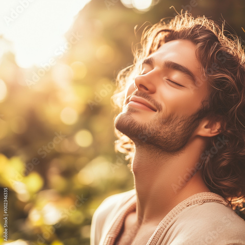 Serene Man Enjoying Relaxation and Sunlight in a Peaceful Garden, Well-being Moment