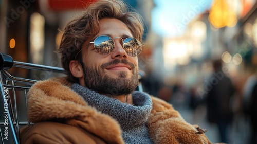 man, city, street, sunglasses, relaxed, calm, serenity, peaceful, happy, content, beard, fashion, style, winter, autumn, coat, fur, brown, shopping, cart, urban, daytime, portrait, casual attire, gentleman, trendy, stylish, cool, photogenic, model, lifestyle, photo, photo, image, picture, person, male, guy, young