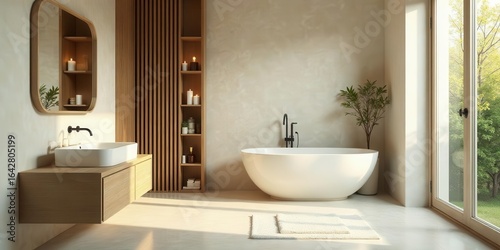 Serene Minimalist Bathroom Design Featuring Modern Freestanding Tub and Oak Vanity