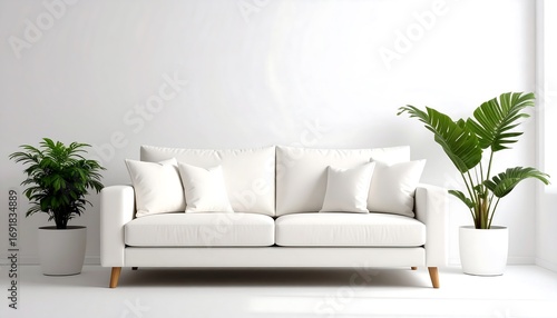 Serene Minimalist Living Room: White Sofa, Lush Greenery, and Soft Lighting