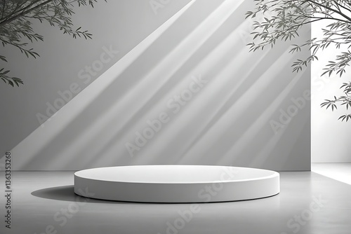 minimalist, platform, cylindrical, white, grey, background, sunlight, shadow, bamboo, branch, leaf, serene, peaceful, elegant, display, clean, line, soft, lighting, mood, sophisticated, tranquil, calm, studio, product, presentation, neutral, simple, modern, design, aesthetic, style, image, visual, composition, light, shadow, texture, monochrome, tone, contrast, space, empty