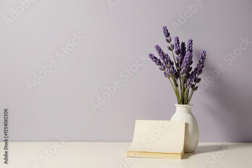 lavandula, bouquet, flower, vase, white, purple, notepad, blank, book, paper, minimalist, still life, serene, calm, peaceful, simple, elegant, clean, light, background, table, home, decor, aroma, fragrance