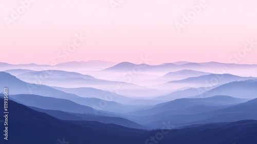 Serene misty hills at sunrise, with layers of mountains in the distance